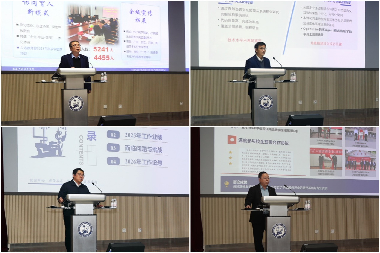 魏垂高强调,2026年工作要锚定“服务国家战略、赋能区域发展、引领终身学习”办学定位,坚持稳中求进、提质增量、规范赋能、创优增效,守住基本盘、拓展新领域、重构新业态,全力办好“值得信赖的继续教育”。为此,重点做好三方面工作:一是优化“十五五”规划,画好发展“路线图”。二是推动业务创新突破,开辟办学“新赛道”:短期培训要布局高端、数字赋能、融合创新,构建全链条能源培训体系,培育地方培训产教融合新模式;学历教育要深耕内涵、精准服务、构建生态,坚持规模质量并重,延伸业务发展链条;国际教育要塑造品牌、深耕本土、拓展多元,加快发展出国留学业务,全力做大国际培训业务;新兴业务要打造特色、推动融合、健全体系,强化数字产品服务输出,构建全龄学习服务体系。三是创新内部治理体系,实施“AI+继续教育”赋能计划,持续深化内部体制机制改革,加快推进办学条件升级改造,激发员工队伍干事活力。