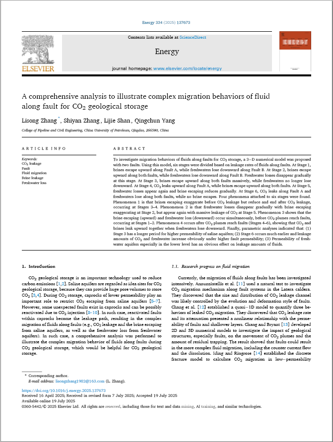 相关成果以“A comprehensive analysis to illustrate complex migration behaviors of fluid along fault forCO2geological storage”为题,发表于《Energy》。张立松副教授为第一作者及通讯作者,中国石油大学(华东)为第一署名单位。该研究得到山东省自然科学基金项目、中央高校基本科研业务费专项资金联合资助。