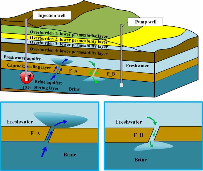 【本站讯】二氧化碳地质封存是减少碳排放的一项重要技术,其中盐水层因其巨大的孔隙体积而被视为理想的封存场所。在封存过程中,低渗透性的盖层起着关键作用,能有效阻止二氧化碳从盐水层中逸出。然而,盖层中可能存在一些未预料到的断层,这些断层可能因二氧化碳注入而被重新激活,从而成为泄漏通道。一旦断层被激活,将导致复杂的流体沿断层迁移,例如封存的二氧化碳可能泄漏、深层盐水可能从盐水层中逸出,同时上覆淡水含水层中的淡水也可能流失。因此,对二氧化碳地质封存过程中沿断层的流体迁移行为进行全面分析至关重要,有助于深入理解泄漏机制、评估封存安全风险,并为优化封存场地选择与工程管理提供科学依据,从而推动该技术更安全、更有效地应用于实际减排。