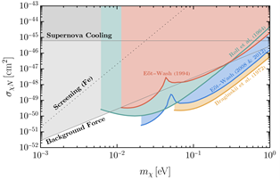 暗物质探测是现代宇宙学和粒子物理中的重大前沿问题之一。对于质量较轻的暗物质,其德布罗意波长可与宏观实验装置的尺度相当,并在与宏观目标发生散射时可以产生显著的相干增强效应。基于这一效应,研究团队分析了暗物质与物体的散射过程以及散射所诱导的受力,这种微弱受力可以通过扭秤实验进行测量。现有高精度扭秤实验尚未发现任何未知力的信号,这一结果可用于限制暗物质散射的强度。研究表明,在0.01–1 eV的质量范围内,现有扭秤实验能够对暗物质-核子散射给出目前最强的限制。