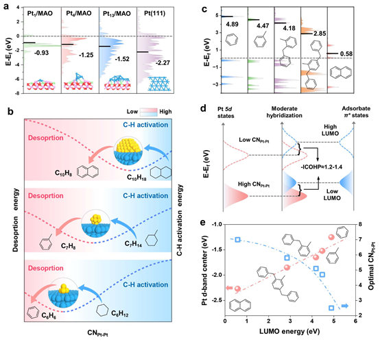 针对这一难题,我校洁净能源与技术国际创新团队通过构建具有连续可调配位环境的精密模型催化剂体系,从原子尺度深入探究了活性位点电子结构对反应性能的调控机制,建立了一种由反应物电子结构主导的普适性催化剂设计原理,揭示了不同环烷烃分子在Pt催化剂表面脱氢活性的“分子指纹”规律。