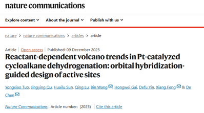 相关研究成果以“Reactant-dependent volcano trends in Pt-catalyzed cycloalkane dehydrogenation: orbital hybridization-guided design of active sites”为题,发表在国际著名学术期刊《Nature Communications》上。脱永笑教授与硕士研究生屈晶莹为共同第一作者,冯翔教授以及陕西氢易能源科技有限公司王斌研究员等为共同通讯作者,中国石油大学(华东)为第一署名单位。该研究得到国家自然科学基金、国家重点研发计划及山东省优秀青年科学基金等项目的资助。